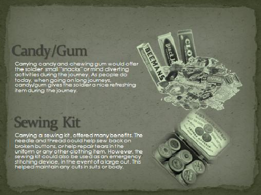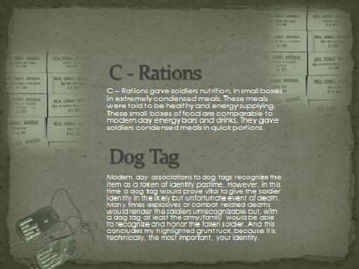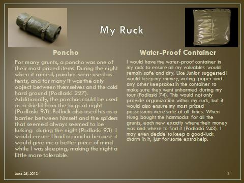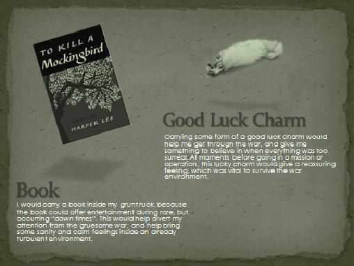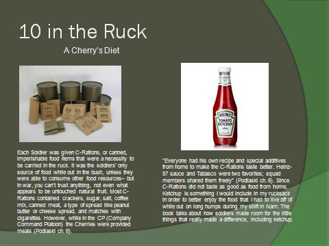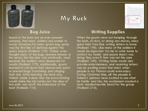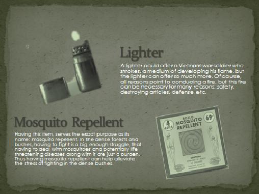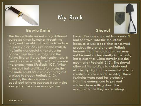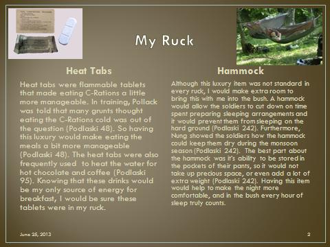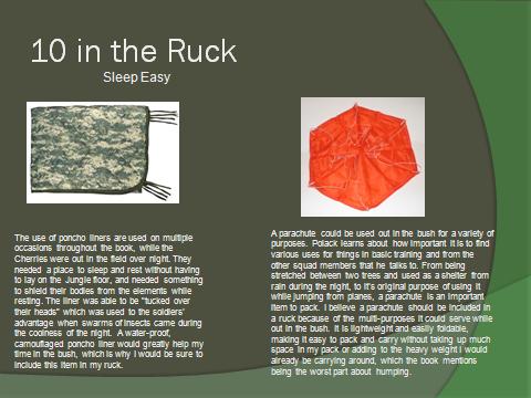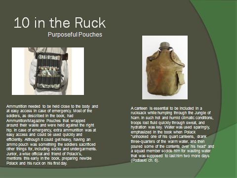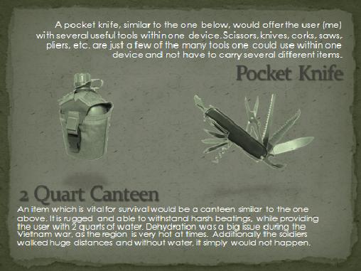 Create 5 slides that illustrate 10 major items (2 items per slide) that you would include in your pack if you had to hump through the bush of Vietnam. Be sure to explain why you chose each item below each illustrative picture.