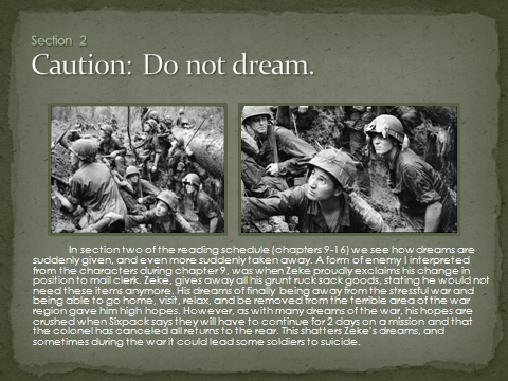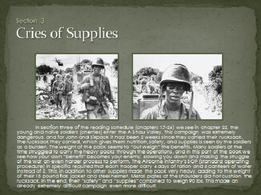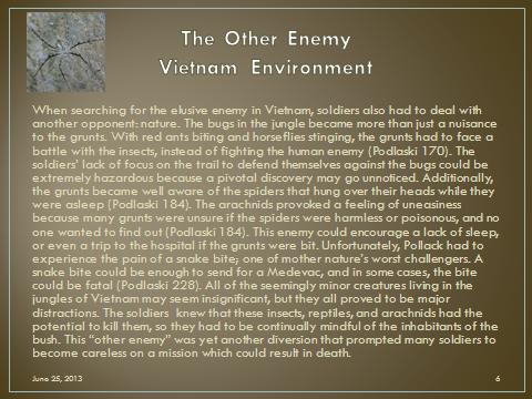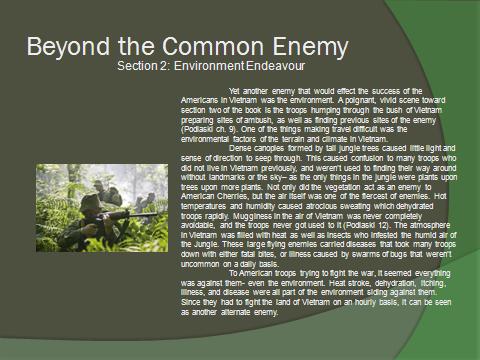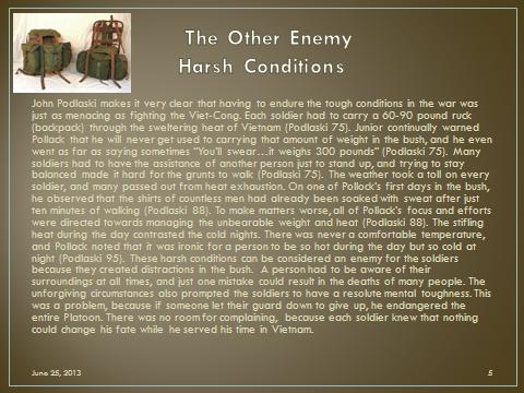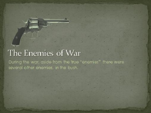 War is hell and there is so much more taking place besides shooting a weapon. In war you will learn that a soldier’s “enemy” isn’t just another person shooting at him. Create 3 slides From Sections 1, 2 and 3 of the book to explain one of the “other” enemies in the bush.