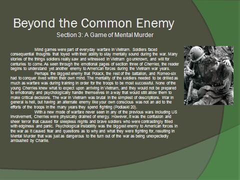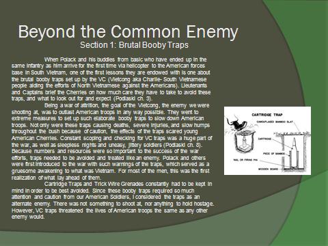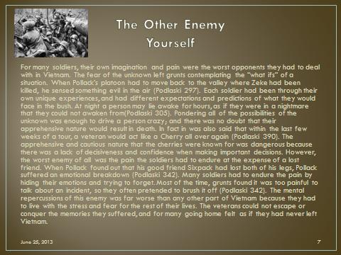 · Within your slide explain why you chose this as an enemy of the soldiers – be sure to cite the specific chapter(s) of the book that helped you identify this enemy.