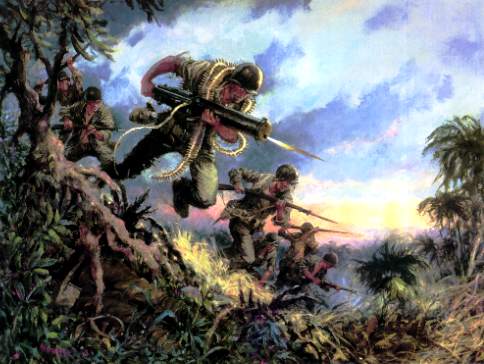 As the night of endless attacks wore on, Paige moved up and down his line, pulling his dead and wounded comrades back into their foxholes and firing a few bursts from each of the four Brownings in turn, convincing the Japanese forces down the hill that the positions were still manned. The citation for Paige’s Medal of Honor Citation defines the event: “When the enemy broke through the line directly in front of his position, P/Sgt. Paige, commanding a machinegun section with fearless determination, continued to direct the fire of his gunners until all his men were either killed or wounded. Alone, against the deadly hail of Japanese shells, he fought with his gun and when it was destroyed, took over another, moving from gun to gun, never ceasing his withering fire.” In the end, Sgt. Paige picked up the last of the 40-pound, belt-fed Brownings (the same design which John M. Browning fired for a continuous 25 minutes until it ran out of ammunition, glowing cherry red, at its first U.S. Army demonstration) and did something for which the weapon was never designed. S t. Paige walked down the hill toward the place where he could hear the last Japanese survivors rallying to move around his flank, the belt-fed gun cradled under his arm, firing as he went.
