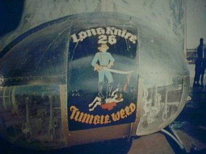 “The nose art is basically the standard design of several of our Huey’s but I added the name “Tumbleweed”. That’s what I called my ship. The door art was a take off of a Sunday morning cartoon character. My CE at that point was a Sergeant John Sulfridge. We had to sneak the parts down town and have the art work done. I sent him in while I waited in the jeep. That was a mistake as you see my last name is misspelled. I was with D-Troop 3/5th From Sept ’70 to ’71. We changed our Unit to C 3/17 sometime before I left. I was the “Slick” Platoon Commander “Long Knife 26”. Image courtesy of Mike Rokey