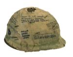 Graffiti on helmets was not too common until the Vietnam War where soldiers found a way to express themselves. The most common writings were a girlfriends name, a city and state back home, and a calendar of some kind to show when they were going home. As the war progressed, slogans and other graffiti were proudly displayed by the wearer.