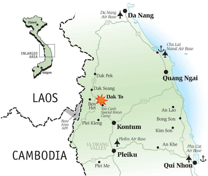 During these multiple engagements, Army intelligence operatives detected structures that looked like a North Vietnamese headquarters area, just a short distance from the Cambodian border and safe havens on the other side. That area, known as “Dogbone Hill,” was a convenient place to fire mortars and rockets into the American base at Dak To.