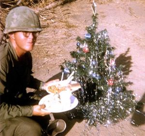 Bu Dop, South Vietnam, December 1967: Spec. 4 Ron Brault of Kansas City, Mo., eats dinner while sitting next to a Christmas tree sent to him by his family
