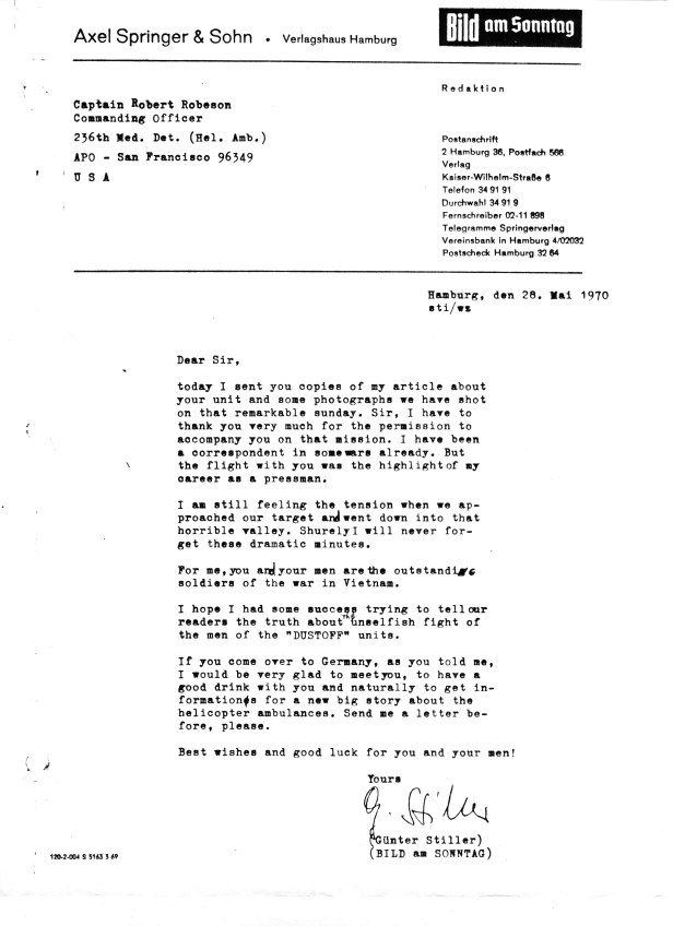 After settling in government housing on base, I wrote a letter to Gunter Stiller at Bild am Sonntag and informed him we’d arrived in Landstuhl and invited him to visit us for dinner, when he could, to reunite and reflect on that special mission. He’d already sent me a packet of 8″ x 10″ photos shot that day and copies of the three-page, 15 1/2″ x 11 1/2,” spread he’d written for his newspaper. He quickly accepted our invitation, we set a date and he drove all the way from Berlin to Landstuhl with his attractive, redheaded fiancee for dinner one evening. We reminisced for hours about what we’d experienced together on that mission. Sharing those unique and dangerous medevac moments together on another faraway continent is something I will always remember.