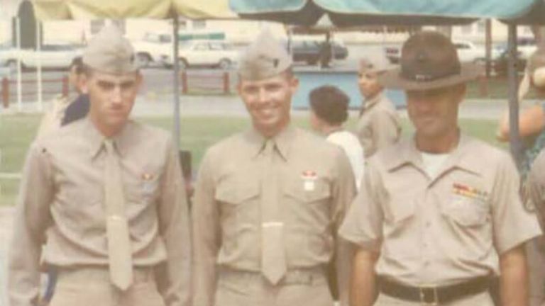 From left to right: Michael Archer, Tom Mahoney, and their senior drill instructor at Boot Camp Graduation, Marine Corps Recruit Depot, San Diego, California, August 1967. (Michael Archer)